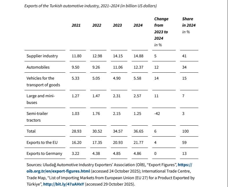 2024 yılında 36,6 milyar dolarlık otomotiv ihracatı yapılırken, bunun yüzde 59’u AB ülkelerine, yüzde 13’ü ise Almanya’ya gitti.