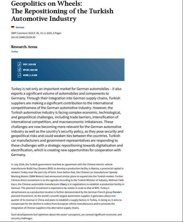Alman hükümetine yakın Alman Dış Politika Enstitüsü (SWP) tarafından yayımlanan raporda, Türkiye’nin otomotiv endüstrisinin yalnızca Avrupa değil, küresel tedarik zincirleri açısından da stratejik hale geldiğine değinildi.