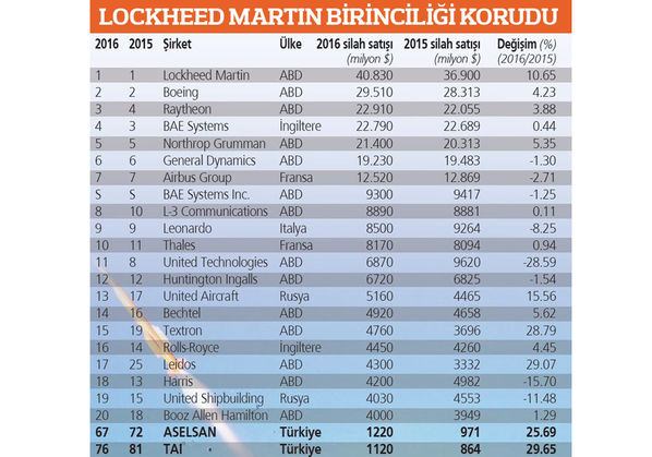 Rapordaki ilk 100 şirket arasında Türkiye’den 2 şirket yer alıyor. Bunlardan Aselsan 5 sıra birden yükselerek 67’nci, TAI de yine 5 sıra tırmanarak 76’ncı sırada yer aldı. Bu dönemde Aselsan 1 milyar 220 milyon dolarlık satış gerçekleştirirken, TAI ise 1 milyar 120 milyon dolarlık silah satışı gerçekleştirdi. Silah satışlarında 6 yıl aradan sonra kaydedilen artışın değerlendirildiği SIPRI raporunda, bazı ülkelerin büyük çaplı savunma programlarını uygulamaya alması ve bölgesel gerilimlerin artışı ile bu durumun ortaya çıktığı vurgulandı. Gazete Habertürk'ten Yiğitcan Yıldız'ın haberine göre raporda, Kuzey Kore krizi ile Çin Denizi’ndeki gerilim, silah satışlarının artmasına örnek olarak öne sürüldü. SIPRI’nin raporuna göre, en fazla silah satan ülkelerin başında, ilk 100’de 38 şirketi yer alan ABD bulunuyor. küresel çaptaki silah satışlarındaki payı yüzde 57.9 olan ABD’li şirketler, 2016’da ise satışlarını yüzde 4 artırdı ve 217.2 milyar dolara çıkardı.