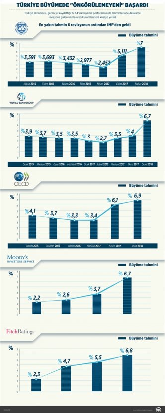 Türkiye'ye ilişkin 2017 büyüme tahminini ilk olarak geçen yılın nisan ayında yüzde 2,2'den yüzde 2,6'ya yükselen Moody's, bu oranı ağustosta 3,7'ye çıkardığını duyurdu. Kuruluş, birçok ekonomik göstergeye kayıtsız kalamayarak, 2018'in şubat ayında ekonomik büyüme beklentisini 3 puan birden artırarak yüzde 6,7'ye revize etmek durumunda kaldı.