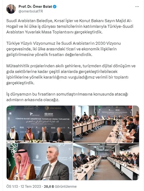 Al-Hogail ve iki ülke iş dünyası temsilcilerinin katılımlarıyla Türkiye-Suudi Arabistan Yuvarlak Masa Toplantısı'nı gerçekleştirdi. Ticaret Bakanı Bolat, Twitter hesabından Türkiye-Suudi Arabistan Yuvarlak Masa Toplantısı'na ilişkin paylaşımda bulundu. DEİK'in düzenlediği Türkiye-Suudi Arabistan İş Forumu'nda konuşan Ticaret Bakanı Ömer Bolat, iki ülke arasındaki ticareti uzun vadede 30 milyar dolara çıkarmayı hedeflediklerini söyledi. Bolat dün de BAE'nin Türkiye'ye 30 milyar dolarlık yatırım yapabileceğini söylemişti. Müthiş gelişmeyi duyurdu, resmi görüşmeler yapıldı.