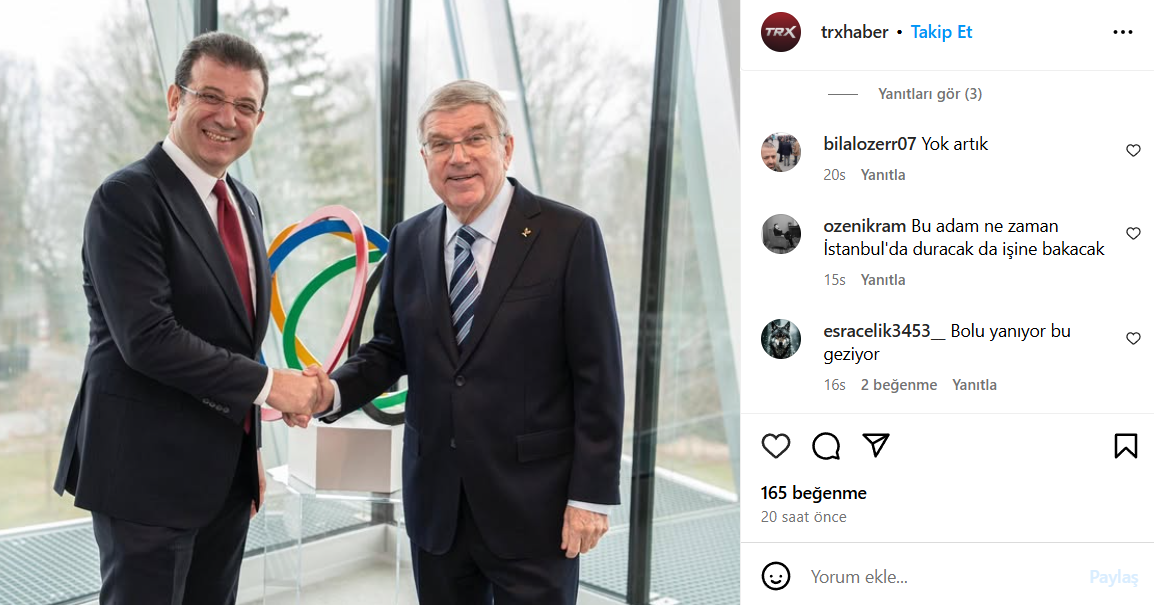 Her fırsatta cumhurbaşkanlığı koltuğunda gözü olan ve ülkeyi yönetmek için soyunan İmamoğlu, 76 kişinin vefat ettiği felaket sırasında İsviçre’de olduğu öğrenildi. Geçtiğimiz yıl İstanbul dışında her kentler poz veren İmamoğlu’nun, 2027 yılında yapılması planlanan ‘2027 Avrupa Oyunları’ için Uluslararası Olimpiyat Komitesi (IOC) Başkanı Thomas Bach ile Lozan Olimpiyat Evi'nde görüştü. Söz konusu skandal ziyareti sosyal medya platformu X’te İngilizce hesabından duyuran CHP’li İmamoğlu, Uluslararası Olimpiyat Komitesi (IOC) Başkanı Thomas Bach ile Lozan Olimpiyat Evi'nde bir araya gelerek İstanbul'un spor dünyasındaki dinamik yolculuğunu konuştuk.