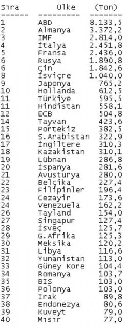 WGC verilerine göre, en büyük altın rezervine sahip 40 ülke şu şekilde sıralandı: