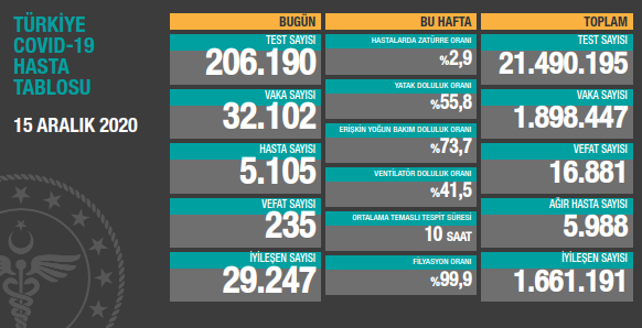 Sağlık Bakanlığı 15 Aralık koronavirüs tablosunu açıkladı. Buna göre; Türkiye'de son 24 saatte 206 bin 190 Kovid-19 testi yapıldı, 32 bin 102 kişinin testi pozitif çıktı, 235 kişi hayatını kaybetti.