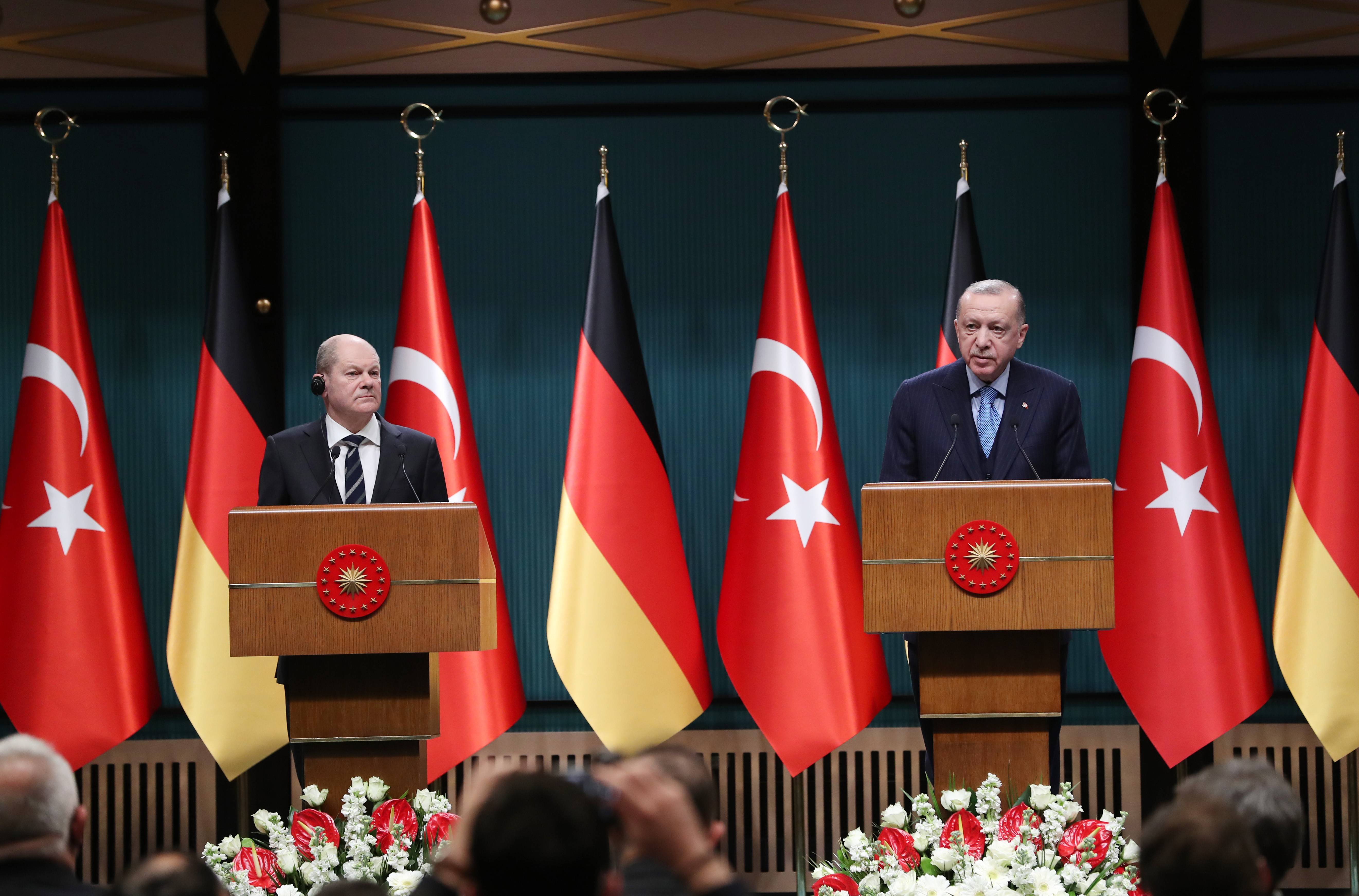 Almanya Şansölyesi Scholz, Cumhurbaşkanı Erdoğan'ın daveti üzerine Ankara'ya geldi. İkili görüşmelerde Cumhurbaşkanı Erdoğan ve Scholz, Türkiye-Almanya ilişkileri ile Ukrayna konusu ele alındı. Görüşme sonrası iki lider, düzenlenen ortak basın toplantısında kameraların karşısına çıktı.