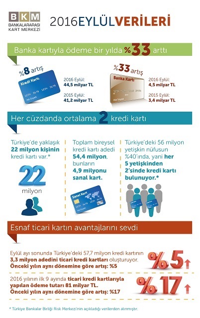Bankalararası Kart Merkezinin (BKM) eylül ayı verilerinden derlediği bilgilere göre, Türkiye'de 57,7 milyon kredi kartı ve 114,7 milyon da banka kartı olmak üzere 172,4 milyon adet kart kullanılıyor. Kredi kartı sayısı, bu yılın eylül ayında geçen yılın aynı dönemine kıyasla değişmezken, banka kartı sayısında yüzde 1'in üzerinde artış kaydedildi.