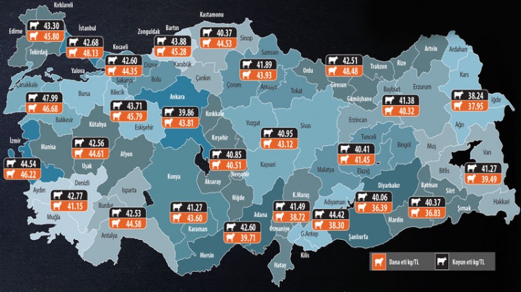 - Ekim 2017 fiyatlarına göre koyun etinin Türkiye genelinde en ucuz olduğu bölge Şanlıurfa ve Diyarbakır. Bu iki şehirde ortalama koyun eti fiyatı 36.3 TL seviyesinde. 26 istatistiki bölge arasında koyun etinin en pahalı olduğu şehirler ise Doğu Karadeniz’de. Trabzon, Ordu, Giresun, Rize, Artvin ve Gümüşhane’de ortalama koyun eti fiyatı 48.48 TL düzeyinde. Dana etinde en büyük fiyat farkları, Türkiye’nin doğusu ile batısı arasındayken; koyun etinde ise fiyat farkları ülkenin kuzeyi ile güneyi arasında belirginleşiyor. Ve koyun etinde en ucuz ile en pahalı bölgeler arasındaki fark da 12 TL’yi aşıyor.
