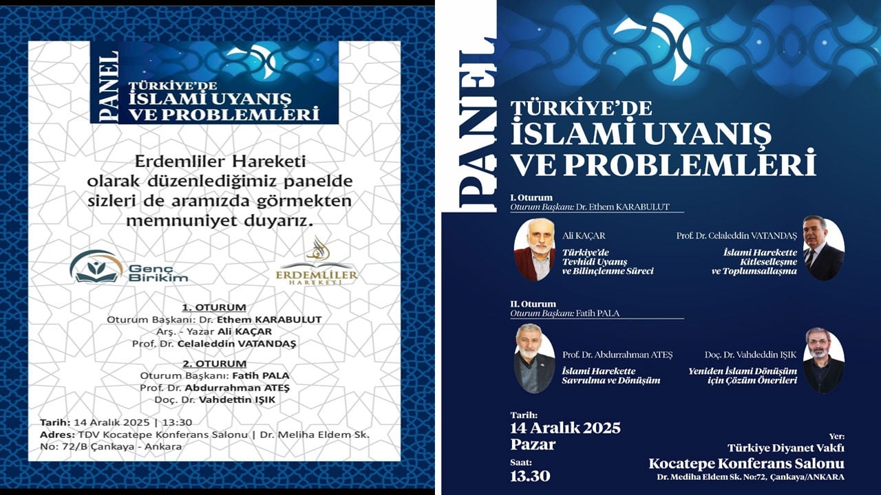 Erdemliler Hareketi ile Genç Birikim Derneği tarafından 14 Aralık Pazar günü Ankara’nın Çankaya ilçesinde yer alan Türkiye Diyanet Vakfı’nın Kocatepe cami yerleşkesi konferans salonunda düzenlenecek ‘Türkiye’de İslami Uyanış ve Problemleri’ paneli ile İslami uyanışı ile önündeki yapısal problemler iki ayrı oturumla masaya yatırılıyor.