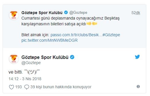 Konuya ilişkin olarak bir açıklama yapan Göztepe, ilk olarak bilgilendirici nitelikte bir paylaşım yaptı ve "Cumartesi günü deplasmanda oynayacağımız Beşiktaş karşılaşmasının biletleri satışa açıldı" ifadelerini kullandı. Bu paylaşımdan sadece 8 dakika sonra bir Tweet daha atan Göztepe'nin paylaşımında ise "Ve bitti" ifadeleri yer aldı.