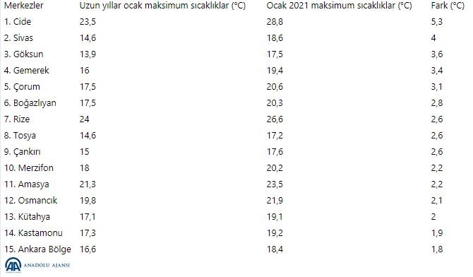 Meteoroloji Genel Müdürlüğü’nün açıkladığı verilere bakıldığı zaman, Türkiye'de uzun yıllar boyunca Ocak ayı sıcaklığı ortalama olarak 2,7 derece olarak ölçüldü. Bu yıl ise ocak ayında havaların mevsim normallerinin üzerinde olmasından dolayı ortalama sıcaklık 5,4 dereceye kadar artış gösterdi.