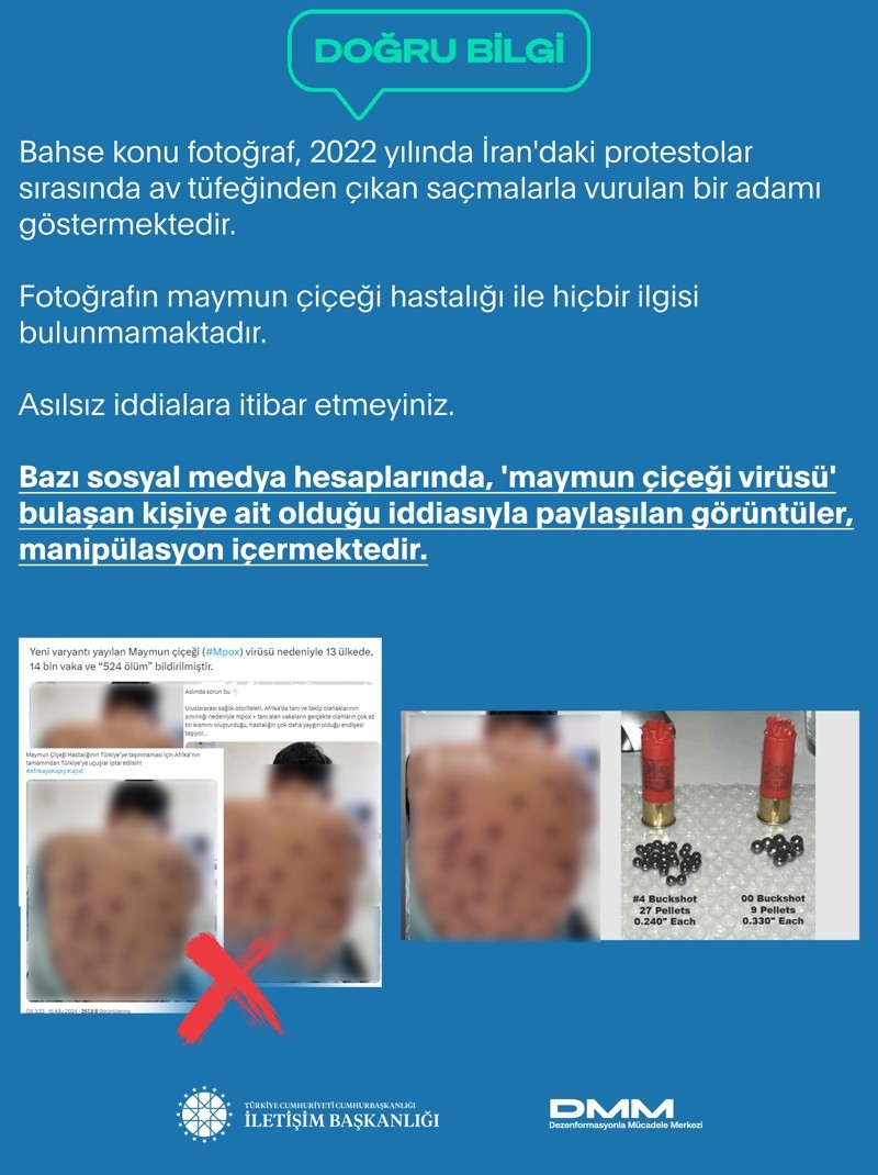 DMM'den yapılan açıklamalara şu ifadelere yer verildi; "Bazı sosyal medya hesaplarında, 'maymun çiçeği virüsü' bulaşan kişiye ait olduğu iddiasıyla paylaşılan görüntüler, manipülasyon içermektedir.