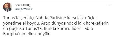 "Tunus'ta şeriatçı Nahda Partisine karşı laik güçler yönetime el koydu. Arap dünyasındaki laik hareketlerin en güçlüsü Tunus'ta. Bunda kurucu lider Habib Burgiba'nın etkisi büyük" diyen Kılıç, Tunus'ta darbe olmadığını ileri sürdü ve şunları kaydetti: