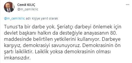 Tunus'ta yaşanan BAE ve Fransa destekli darbe girişimine Türkiye'deki laikçilerden destek geldi. Darbeye kılıf uydurup meşru gösterme çabası içine giren Kemalist ilahiyatçı Cemil Kılıç, "Darbeye karşıyız, demokrasiyi savunuyoruz. Demokrasinin ön şartı laikliktir. Laiklik yoksa demokrasinin olması imkansızdır" ifadelerini kullandı.