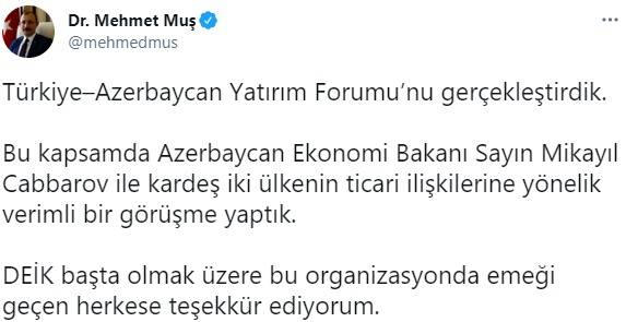 Ticaret Bakanı Dr. Mehmet Muş, Azerbaycan Ekonomi Bakanı Mikayıl Cabbarov ile yaptığı görüşmeyle alakalı sosyal medya hesabı üzerinden bir paylaşımda bulundu. Muş paylaşımında, “Türkiye–Azerbaycan Yatırım Forumu’nu gerçekleştirdik” ifadelerini kullandı.