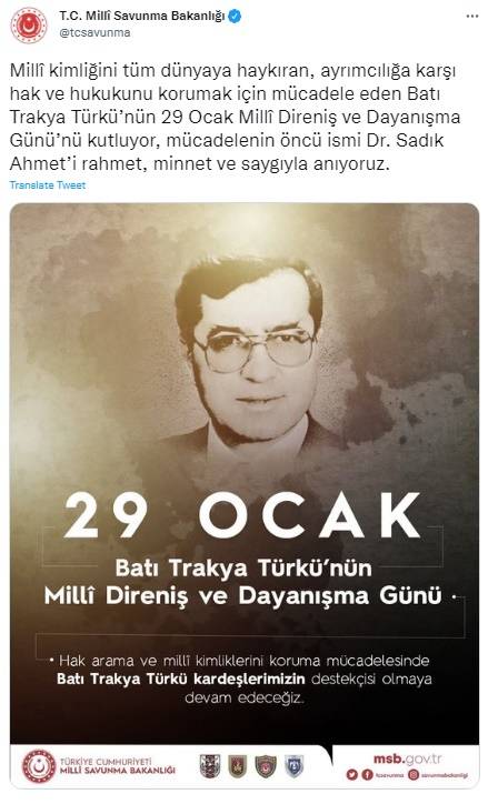 MSB'nin sosyal medya hesabından yayımlanan mesajda, "Milli kimliğini tüm dünyaya haykıran, ayrımcılığa karşı hak ve hukukunu korumak için mücadele eden Batı Trakya Türkü'nün 29 Ocak Milli Direniş ve Dayanışma Günü'nü kutluyor, mücadelenin öncü ismi Dr. Sadık Ahmet'i rahmet, minnet ve saygıyla anıyoruz" ifadesi kullanıldı.