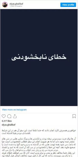 Muhammed Bakır Galibaf'ın oğlu Elias Galibaf, sosyal medya platformu Instagram'dan paylaştığı gönderide; Türkiye'de yapılan alışverişi doğrulayarak, babasının yapılan alışverişten rahatsızlık duyduğunu ve karşı olduğunu söyledi.