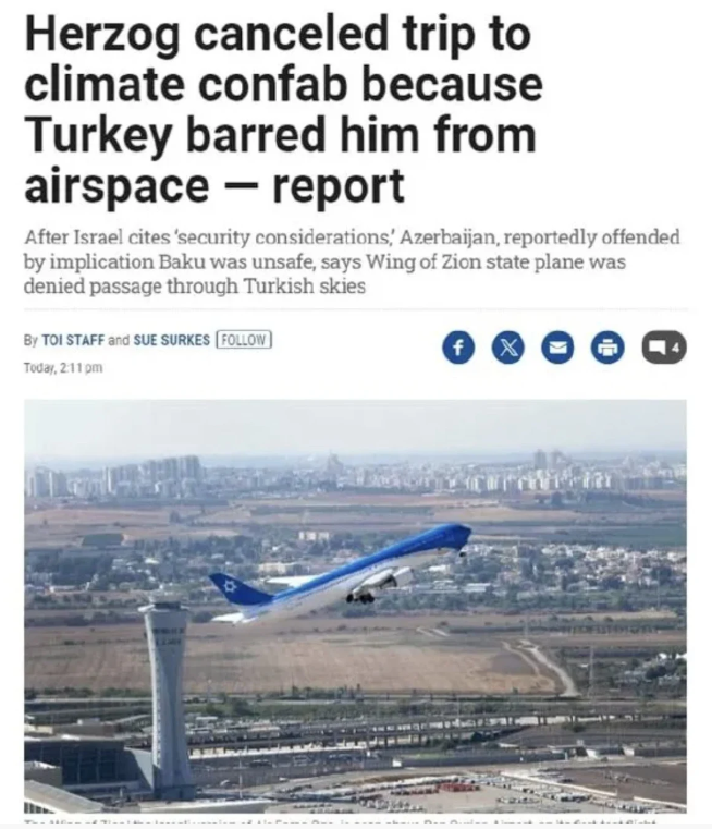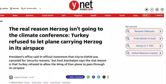 İsrail, Cumartesi günü yaptığı resmi açıklamada, Cumhurbaşkanı Isaac Herzog'un Azerbaycan'a yapmayı planladığı COP29 ziyareti'nin "güvenlik gerekçeleriyle" iptal edildiğini duyurdu. Ancak Yedioth Ahronot gazetesinin haberine göre, Azerbaycan Dışişleri Bakanlığı'na yakın kaynaklar, iptalin gerçek nedeninin Türkiye'nin, İsrail Cumhurbaşkanlığı'na ait 'Wing of Zion' adlı uçağın hava sahasından geçişine izin vermemesi olduğunu belirtti.