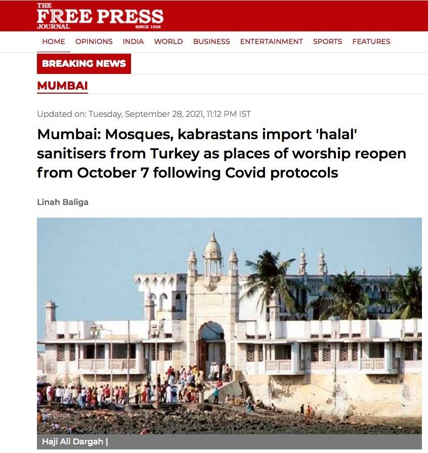 Ülkedeki pek çok cami ve İslam merkezinin Türkiye’den dezenfektan siparişinde bulunduğunu kaydeden Thackeray, Türkiye’den sipariş edilen dezenfektanların içerisinde alkol bulunmadığını ve Müslüman halkın da buna büyük ilgi gösterdiğini aktardı. Mahim Dergahı’nın yöneticisi olan Suhail Khandwani ise ekim ayında açılacak camilerde Covid-19 önlemleri ihmal edilmeden dinî vecibelerin yerine getirilmesi için Türkiye’de bir şirketle anlaştıklarını belirterek, “Türkiye’de helal dezenfektan satan bir firmadan içerisinde alkol bulunmayan helal dezenfektanlar alacağız” dedi. Khandwani, Avrupa’dan gelen dezenfektanların içerisinde alkol bulunduğundan dolayı bu ürünlerle camilere girmelerinin mümkün olmadığını söylerken, helal dezenfektanları üreten firma, ürünlerinin Rusya, Almanya ve İngiltere’de bulunan Müslümanlardan yoğun ilgi gördüğünü belirtti.