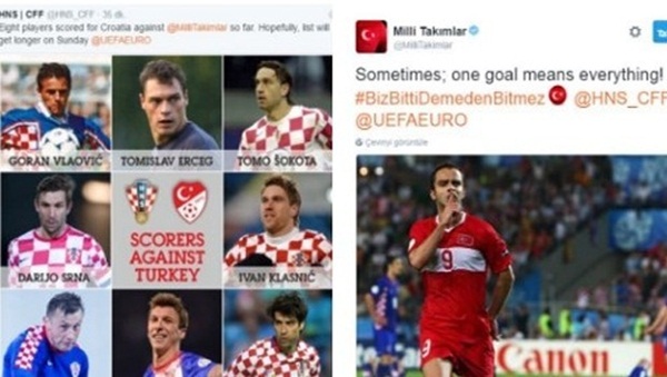 İki ülke milli takımının hesapları, Twitter üzerinden mesajlaştı. Hırvat hesabı, bugüne kadar 8 milli oyuncunun Türkiye'ye gol attığını, Pazar günü bu sayının artmasını dilediklerini yazdı. Buna cevap verem Türkiye hesabı, Semih Şentürk'ün EURO2008 çeyrek finalinde uzatmaların uzatma dakikasında attığı golü hatırlattı.