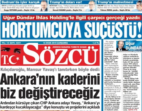 İnşaatçı Turanlı'dan 1,5 milyon lira aldığı iddia edilen Sözcü'nün sürmanşetinde ise Türkiye Gazetesi'nin bağlı kuruluşu olduğu İhlas Holding hedef alındı. Uğur Dündar'ın yazısını sürmanşete taşıyan Sözcü, 'hortumcuya suçüstü' başlığını kullandı.