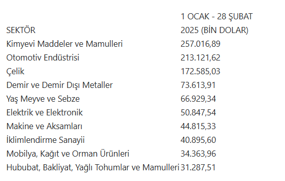 Bu arada TİM verilerine göre, Romanya'ya ocak-şubat döneminde bazı sektörlerin gerçekleştirdiği ihracat miktarları (bin dolar) şöyle: