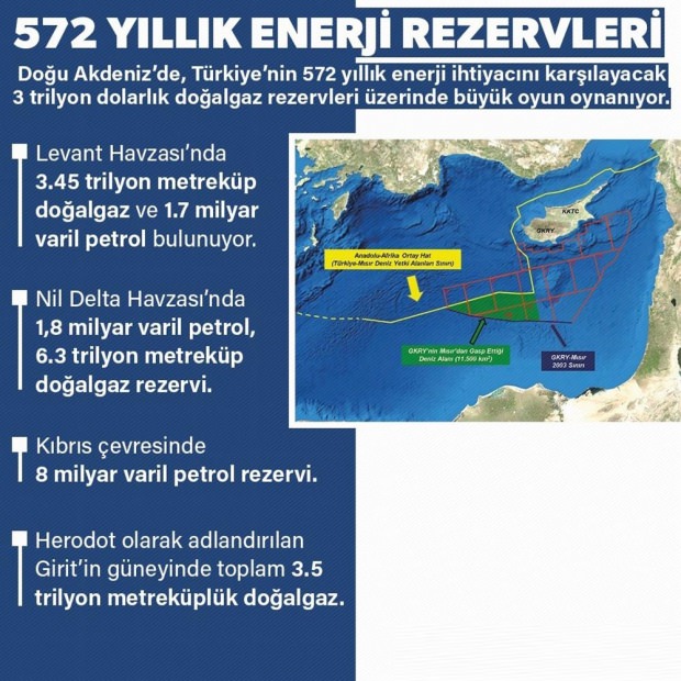 Uzmanlar tarafından yapılan tespitler, Doğu Akdeniz’de toplam değeri 3 trilyon doları bulan doğalgaz yatağı bulunduğunu gösteriyor. ABD Jeolojik Araştırmalar Merkezi tahminlerine göre Kıbrıs, Lübnan, Suriye ve İsrail arasında kalan bölge olan Levant Havzasında 3,45 trilyon metreküp doğalgaz ve 1,7 milyar varil petrol bulunuyor. Yine Nil Delta Havzasında yaklaşık 1,8 milyar varil petrol, 6,3 trilyon metreküp doğalgaz ve 6 milyar varil sıvı doğalgaz yatağı olduğu tahmin ediliyor. Kıbrıs Adası çevresinde olduğu düşünülen 8 milyar varil petrol yatağının dışında Heredot olarak adlandırılan Girit’in güney ve güneydoğusundaki alanda ise toplam 3.5 trilyon metreküplük doğalgaz bulunduğu tahmin ediliyor.