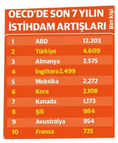 Listenin başında ise 12,2 milyon kişilik ek istihdam ile ABD bulunuyor. Örgüt üyesi ülkeler arasında en çok yeni istihdam üreten ilk 10 listesine Avrupa’dan üç ülke yer aldı. Ayın dönemde Almanya’nın istihdam artışı 2,5 milyon, İngiltere’nin istihdam artışı 2,4 milyon, Fransa’nın istihdam artışı ise 725 bin kişide kaldı. ABD’nin ardından en çok istihdam oluştura Türkiye, istihdam performansıyla kendisiyle aşağı yukarı aynı sayıda nüfusa sahip olan Almanya’yı ikiye katladı. İngiltere, Fransa ve diğer Avrupa ülkeleri ise çok daha az sayıda ek istihdam oluşturabildi. Son yedi yıllık dönemde Meksika istihdamını 2,2 milyon, Güney Kore 2,1 milyon, Kanada 1,1 milyon, Şili 984 bin, Avustralya ise 954 bin kişi arttırdı.
