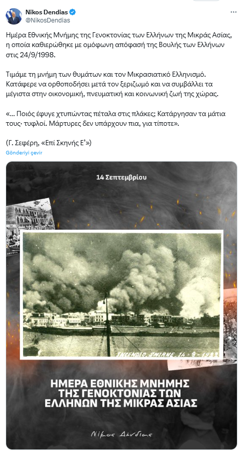 Yunanistan Savunma Bakanı Nikos Dendias sosyal medya hesabından yaptığı paylaşımda Yunanlıların Anadolu'dan kaçışlarına ilişkin sözde "soykırım" nitelemesi yaparak "Yunan Parlamentosu'nun 24/9/1998 tarihinde oybirliğiyle aldığı kararla kurulan Küçük Asya Rumlarının Soykırımını Anma Ulusal Günü." dedi ve şu ifadeleri kullandı: