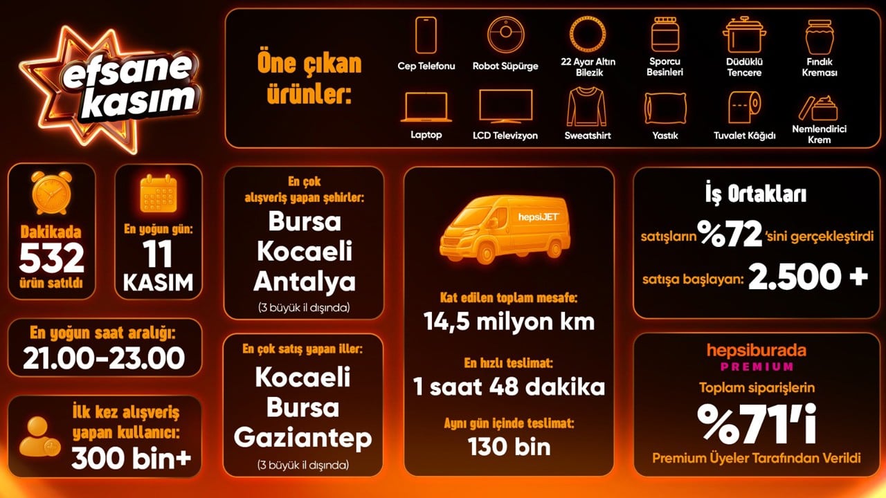 Hepsiburada’da Kasım ayında trafik rekoru kırıldı. Bu yıl Efsane Kasım’ın en yoğun günü 11 Kasım oldu. Kullanıcılar en çok 21.00–23.00 saatleri arasında alışveriş yaptı. Dönem boyunca 300 binden fazla kişi Hepsiburada’dan ilk kez alışveriş yaptı. Türkiye genelinde kampanya süresince dakikada 532 ürün satıldı. Hepsiburada platformunda bu sene Efsane Kasım kampanya döneminde verilen siparişlerin sayısı geçen seneye kıyasla %16 oranında arttı.