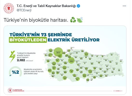 Enerji ve Tabii Kaynaklar Bakanlığı resmi sosyal medya hesabından, Türkiye’nin Biyokütle haritası yayımlandı.