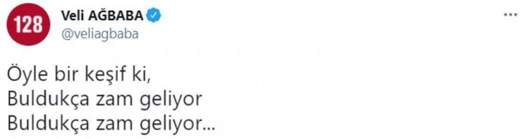 CHP Genel Başkan Yardımcısı ve Malatya Milletvekili Veli Ağbaba, sosyal medya hesabından yaptığı açıklamasında "Öyle bir keşif ki, buldukça zam geliyor, buldukça zam geliyor..." ifadelerini kullandı.
