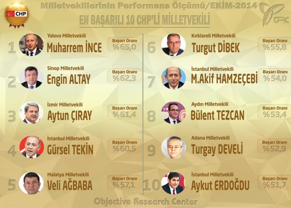 CHP'de ise Yalova Milletvekili Muharrem İnce ilk sırada, Sinop Milletvekili Engin Altay ikinci sırada, İzmir Milletvekili Aytun Çıray ise üçüncü sırada yer aldı. CHP'nin en başarılı 10 milletvekili arasında kadın vekillerin yer almadığı görüldü.