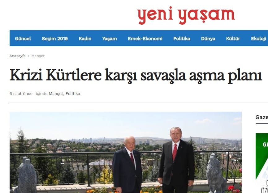 Terör örgütü PKK'nın yayın organı olarak bilinen Yeni Yaşam gazetesi, Cumhurbaşkanı Recep Tayyip Erdoğan’ın Fırat’ın doğusuna başlatılacak operasyonlara ilişkin yaptığı açıklamaların ardından karalama kampanyası başlattı. Terör hedeflerinden gelen tehditlerin bertaraf edilmesi adına başlatılacak operasyonlar için, “Kürtler hedefte” diyen PKK yayın organı, “Krizi Kürtlere karşı savaşla aşma planı” başlığıyla yayınladığı haberde, operasyonu Kürtlere karşı başlatılmış gibi lanse etti.