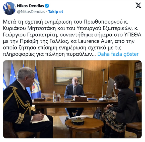 Milli Savunma Bakanı Nikos Dendias, Başbakan Kyriakos Mitsotakis ve Dışişleri Bakanı Giorgos Gerapetritis'in konuyla ilgili bilgilendirme yapmasının ardından, konuyla ilgili resmi bilgi talep ettiği Fransa Büyükelçisi ile bugün Dışişleri Bakanlığı'nda bir araya geldi.