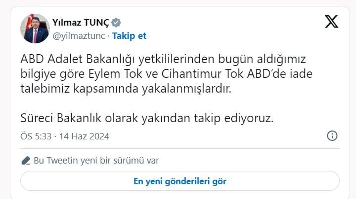 Bakan Tunç, “ABD Adalet Bakanlığı yetkililerinden bugün aldığımız bilgiye göre Eylem Tok ve Cihantimur Tok ABD’de iade talebimiz kapsamında yakalanmışlardır.” dedi.