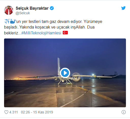 Baykar Teknik Müdürü Selçuk Bayraktar sosyal medya hesabından yer testleri devam eden Akıncı’nın yeni görüntülerini paylaştı.