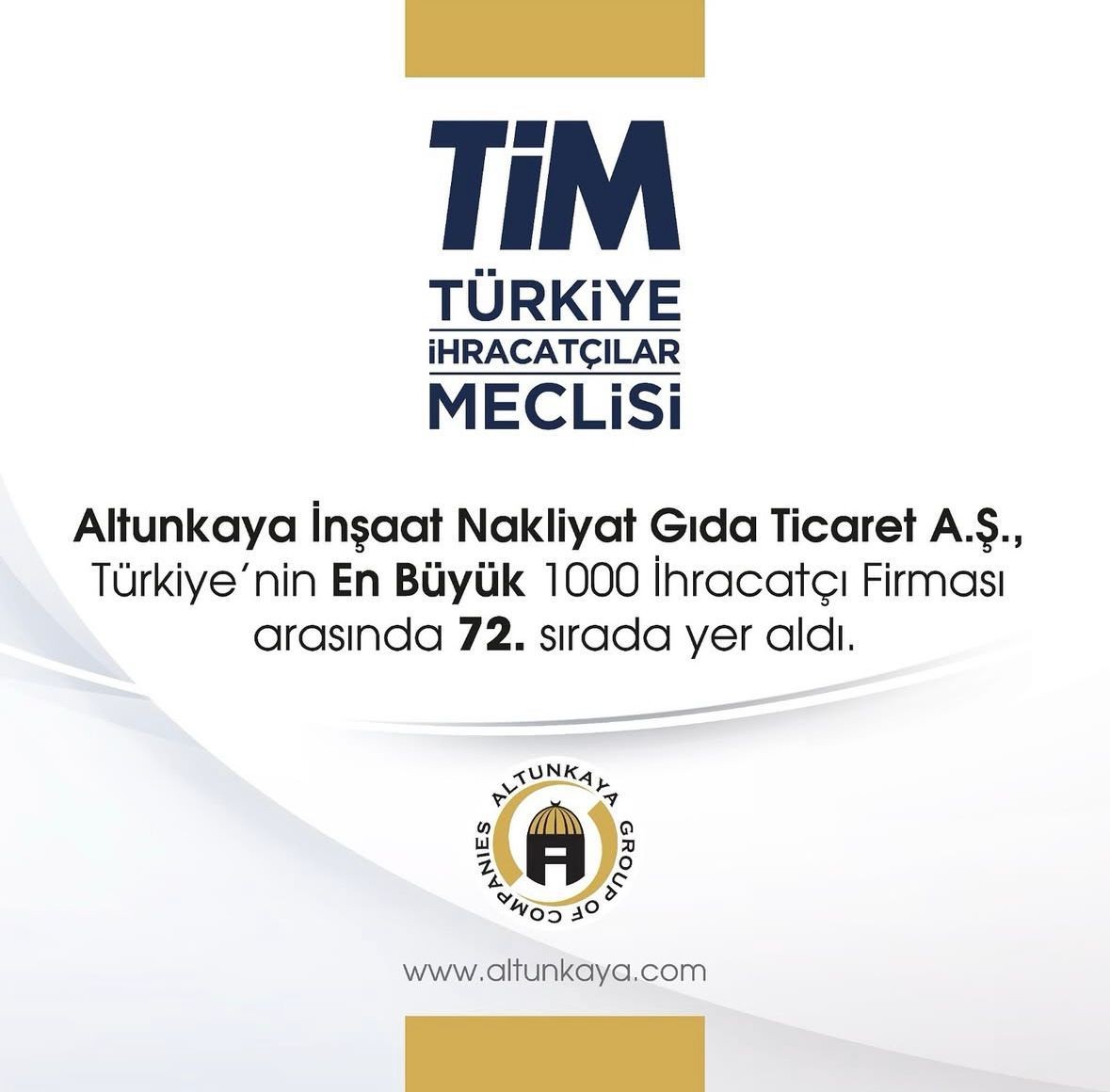 İstanbul Haliç Kongre Merkezi’nde Cumhurbaşkanı Recep Tayyip Erdoğan’ın katılımıyla düzenlenen Türkiye İhracatçılar Meclisi (TİM) 32. Olağan Genel Kurulu ve “İhracatın Şampiyonları Ödül Töreni”nde, Altunkaya İnşaat Nakliyat Gıda Ticaret A.Ş., sektörel sıralamada 72. sıraya yerleşerek Türkiye’nin ihracat devleri arasındaki yerini sağlamlaştırdı.