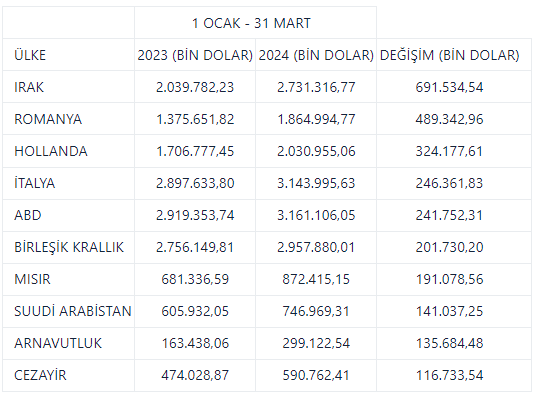 Türkiye'nin ihracatında, yılın ilk çeyreğinde 2023'ün aynı dönemine göre değer bazında en fazla artış görülen ülkeler şöyle: