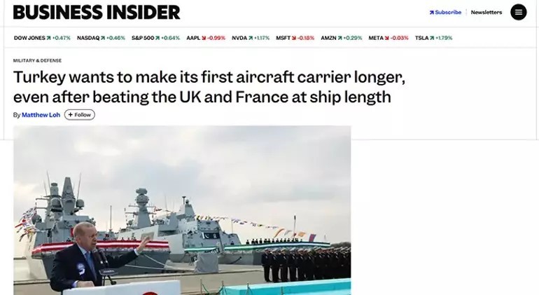 ABD merkezli Business Insider, “Türkiye, NATO müttefikleri arasında İngiltere ve Fransa’yı geride bırakarak en uzun savaş gemilerinden birine sahip olmaya hazırlanıyor” derken bu hamlesi ile dünyanın en büyük uçak gemilerine sahip olan ABD ile aynı uzunluk ligine yaklaşmış durumda yorumunda bulundu.