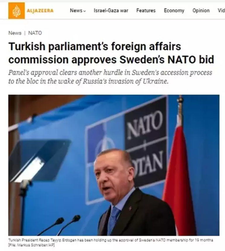 Al Jazeera 19 aylık gecikmeden sonra İsveç'in NATO'ya bir adım daha yaklaştığını ve bunun ittifakın genişletilmesine yönelik önemli bir adım olduğunu yazdı.