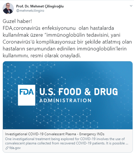 Çilingiroğlu, paylaşımında "FDA, coronavirüs enfeksiyonunu olan hastalarda kullanılmak üzere “immünoglobülin tedavisini, yani Coronavirüs’ü komplikasyonsuz bir şekilde atlatmış olan hastaların serumundan edinilen immünoglobülin’lerin kullanımını, resmi olarak onayladı" ifadelerini kullandı.