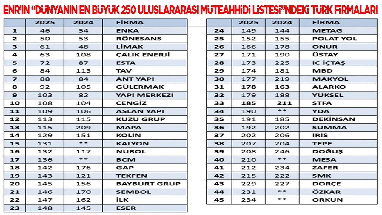 ENR’ın yayımladığı “Dünyanın En Büyük 250 Uluslararası Müteahhidi” listesinde Türkiye, 45 firmayla ikinci sıradaki yerini korudu. İlk 100’e giren Türk firma sayısı 8’e yükselirken, enerji alanında bir Türk firması da ilk 10’a girdi. Müteahhitlerimiz, 2024’te 137 ülkede 31 milyar doları aşan yeni projeye imza attı. Listenin en ilk sırasında 76 firmayla Çin, üçüncü sırasında ise 42 firmayla ABD yer alıyor.