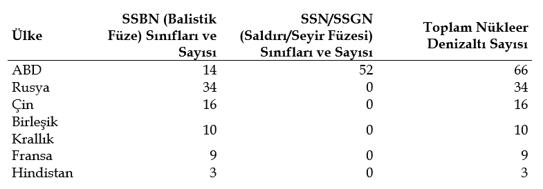 Halihazırda 6 ülke nükleer denizaltılara sahip bulunmaktadır. Hindistan hariç diğer 5 ülke BM Güvenlik Konseyi'nin daimi üyesidir.