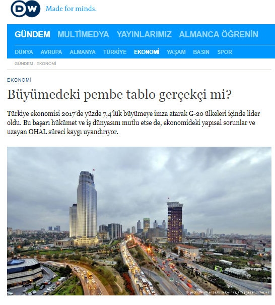DW’nin “Büyümedeki pembe tablo gerçekçi mi?” başlığıyla bugün yayınladığı haberinde “Bu başarı hükümet ve iş dünyasını mutlu etse de ekonomideki yapısal sorunlar ve uzayan OHAL süreci kaygı uyandırıyor. Türk ekonomisi 2018’de yavaşlayacak” ifadelerine yer verildi.