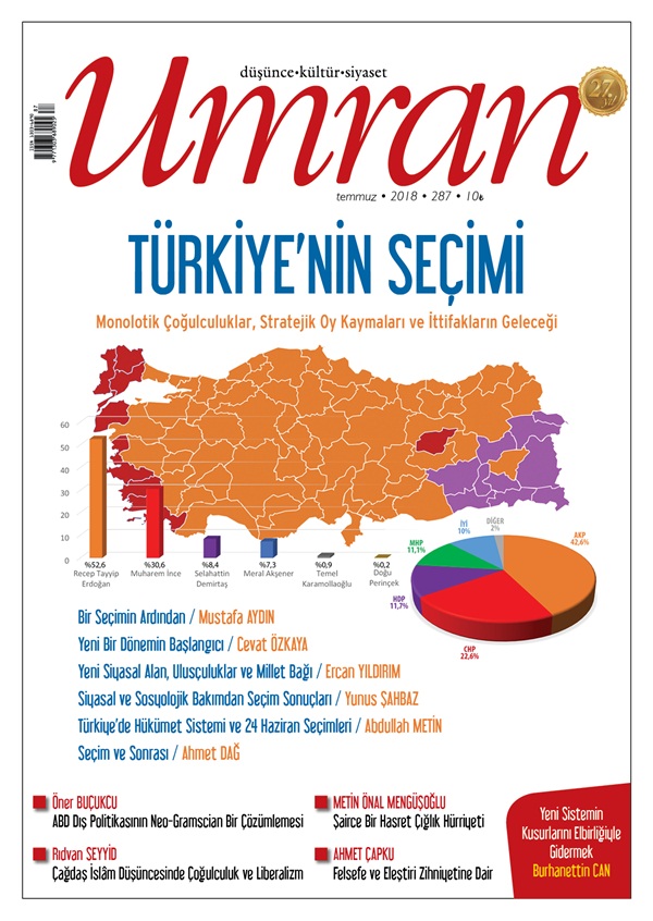 24 Haziran seçimlerinin ortaya çıkardığı tablo “YeniTürkiye”nin işleyişi, yeni siyasal alanın tanımlanması, şimdiye kadar yürürlükte kalan “toplum-siyaset mühendisliği”ningidişatı, statükonun evrilmesi, dünya sistemiyle ilişkilerin düzenlenmesi ve kısa vadeli bölgesel gelişmeler açısındankritikgelişmelere gebe… Şurası kesin: 24 Haziran seçimleri ile birlikte “cumhurbaşkanlığı hükümet sistemi” geri dönülmesiçok zor bir biçimde hayatımıza girmiştir. Bir bakıma Cumhuriyet Türkiye’sinin üçüncü evresine geçilmiş oldu. 27 Mayıs 1960ihtilali sonucunda 61 anayasası ile hayatımıza giren ve süreç içinde değişik düzenlemelerle günümüze kadar gelen yönetimsisteminden başka bir sisteme geçiyoruz.