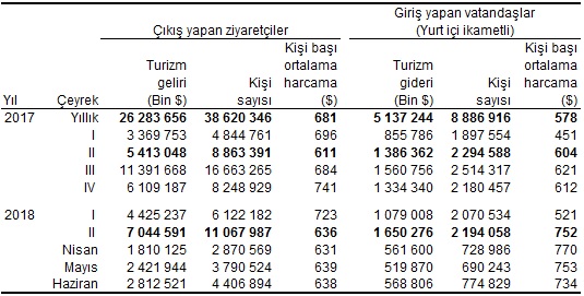 Ülkemizden çıkış yapan ziyaretçi sayısı 2018 yılı II. çeyreğinde bir önceki yılın aynı çeyreğine göre %24,9 artarak 11 milyon 67 bin 987 kişi oldu. Bunların %89’unu 9 milyon 855 bin 102 kişi ile yabancılar, %11’ini ise 1 milyon 212 bin 885 kişi ile yurt dışında ikamet eden vatandaşlar oluşturdu.