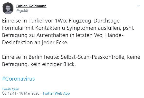 "1 hafta önce Türkiye’ye girişim; uçakta bilgilendirme, özel & iletişim bilgileri hakkında form doldurma, nerde ne kadar kaldığım/kalacağım hakkında sorgu, her köşede dezenfektan. Bugün Berlin’e girişim; kimlik makinasından otomatik geçiş, sorgu sual yok.”