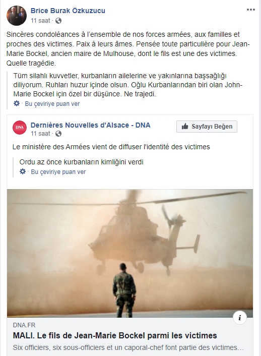 CHP Strazburg Birliği Başkanı Burak Özkuzucu, sömürgecilik faaliyetleri için Mali'de bulunan Fransızların 2 helikopterinin havada çarpışması sonucu ölen askerlere üzüldüğünü ifade eden bir paylaşımda bulundu.