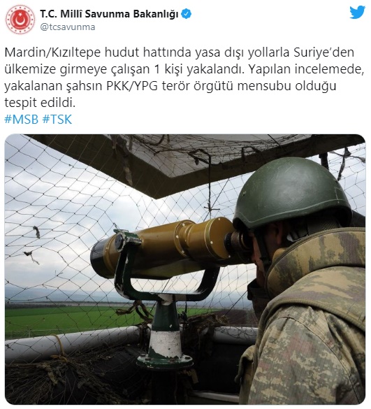 Bakanlığın Twitter hesabından yapılan açıklamada, "Mardin/Kızıltepe hudut hattında yasa dışı yollarla Suriye'den ülkemize girmeye çalışan 1 kişi yakalandı. Yapılan incelemede, yakalanan şahsın PKK/YPG terör örgütü mensubu olduğu tespit edildi." ifadeleri kullanıldı.