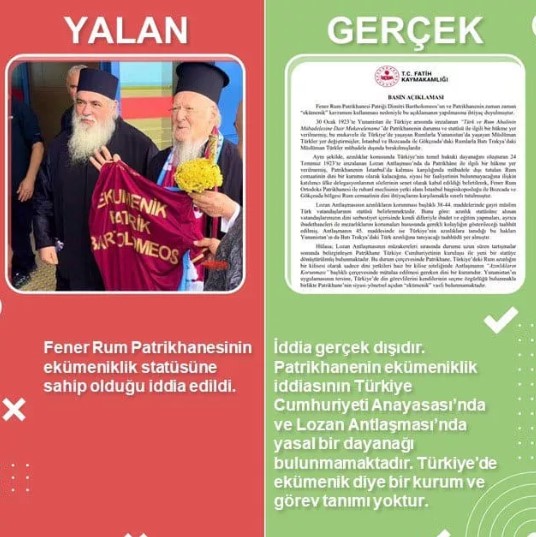 Fatih Kaymakamlığı, kaymakamlığına bağlı dini bir kuruluş olarak kabul edilen Fener Rum Patrikhanesinin "ekümeniklik" iddiasının hukuki gerçeklerle bağdaşmadığı ve "ekümenik" sıfatının bulunmadığı belirtildi